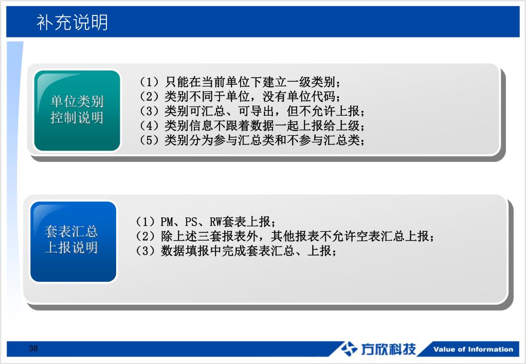 补充说明 (1)只能在当前单位下建立一级类别; (2)类别不同于单位,没有单位代码; (3)类别可汇总、可导出,但不允许上报; (4)类别信息不跟着数据一起上报给上级; (5)类别分为参与汇总类和不参与汇总类; 单位类别 控制说明 (1)PM、PS、RW套表上报; (2)除上述三套报表外,其他报表不允许空表汇总上报; (3)数据填报中完成套表汇总、上报; 套表汇总 上报说明