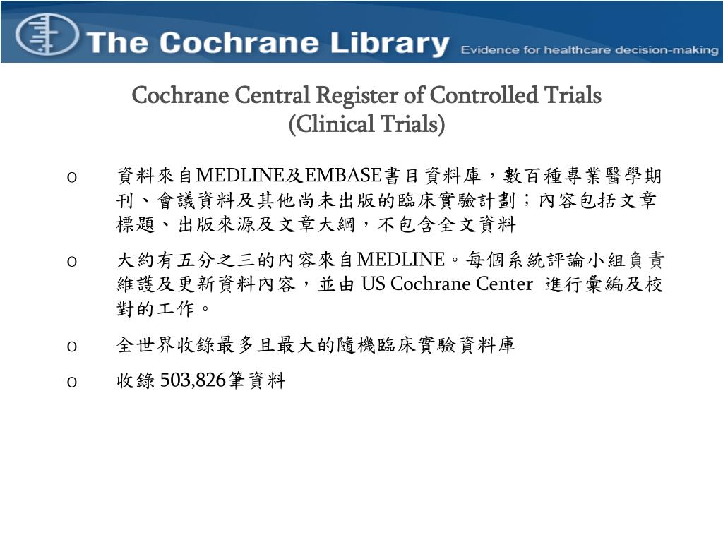 Cochrane Central Register of Controlled Trials (Clinical Trials) • 資料來自MEDLINE及EMBASE書目資料庫,數百種專業醫學期刊、會議資料及其他尚未出版的臨床實驗計劃;內容包括文章標題、出版來源及文章大綱,不包含全文資料 • 大約有五分之三的內容來自MEDLINE。每個系統評論小組負責維護及更新資料內容,並由US Cochrane Center進行彙編及校對的工作。 • 全世界收錄最多且最大的隨機臨床實驗資料庫 • 收錄503,826筆資料
