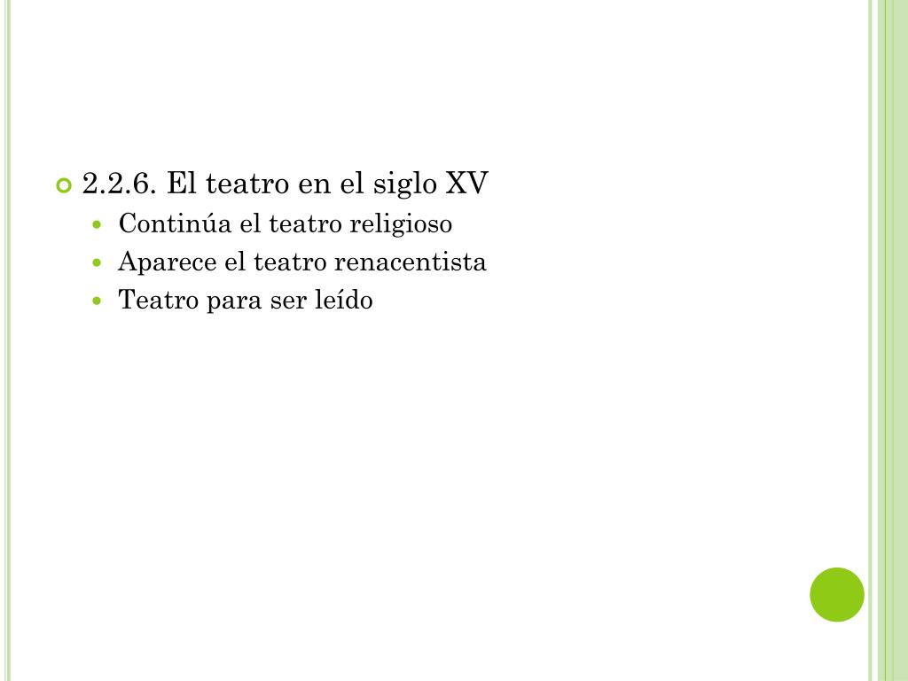 2.2.6. El teatro en el siglo XV • Continúa el teatro religioso • Aparece el teatro renacentista • Teatro para ser leído