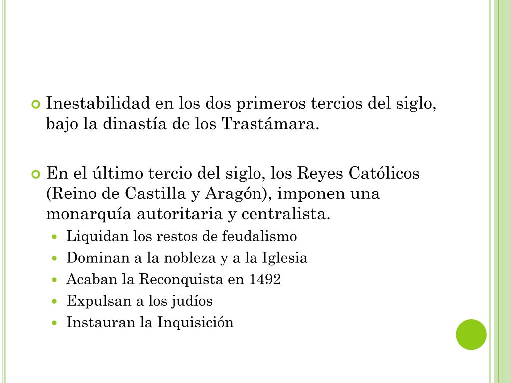 Inestabilidad en los dos primeros tercios del siglo, bajo la dinastía de los Trastámara. • En el último tercio del siglo, los Reyes Católicos (Reino de Castilla y Aragón), imponen una monarquía autoritaria y centralista. • Liquidan los restos de feudalismo • Dominan a la nobleza y a la Iglesia • Acaban la Reconquista en 1492 • Expulsan a los judíos • Instauran la Inquisición