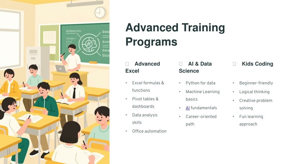 5. Advanced Training Programs ? Advanced Excel ? AI & Data Science ? Kids Coding • Excel formulas & functions • Python for data • Beginner-friendly • Machine Learning basics • Logical thinking • Pivot tables & dashboards • Creative problem solving • AI fundamentals • Data analysis skills • Career-oriented path • Fun learning approach • Office automation