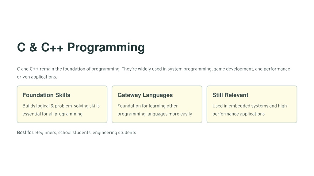 C & C++ Programming C and C++ remain the foundation of programming. They're widely used in system programming, game development, and performance- driven applications. Foundation Skills Gateway Languages Still Relevant Builds logical & problem-solving skills essential for all programming Foundation for learning other programming languages more easily Used in embedded systems and high- performance applications Best for: Best for: Beginners, school students, engineering students
