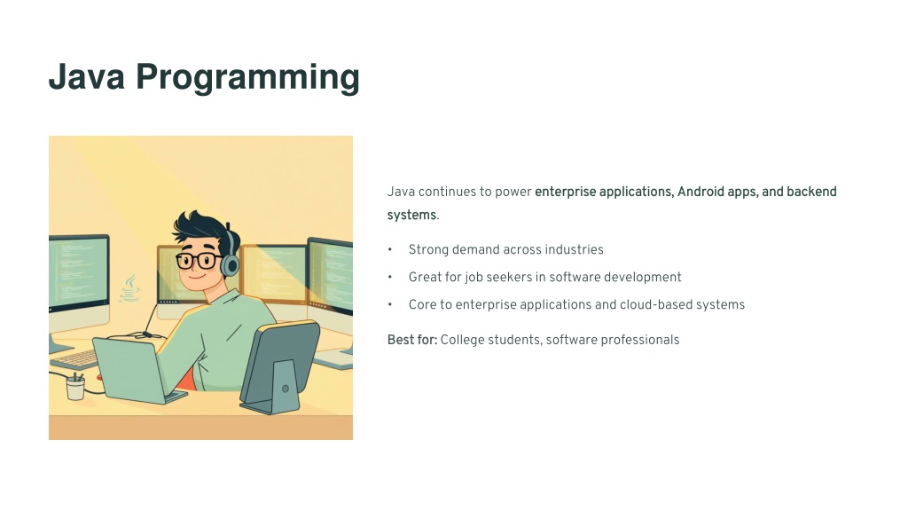 Java Programming Java continues to power enterprise applications, Android apps, and backend enterprise applications, Android apps, and backend systems systems. • Strong demand across industries • Great for job seekers in software development • Core to enterprise applications and cloud-based systems Best for: Best for: College students, software professionals