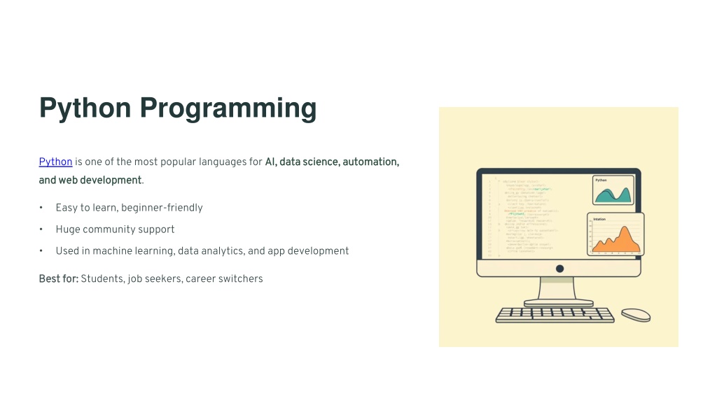 Python Programming Python is one of the most popular languages for AI, data science, automation, and web development and web development. AI, data science, automation, • Easy to learn, beginner-friendly • Huge community support • Used in machine learning, data analytics, and app development Best for: Best for: Students, job seekers, career switchers