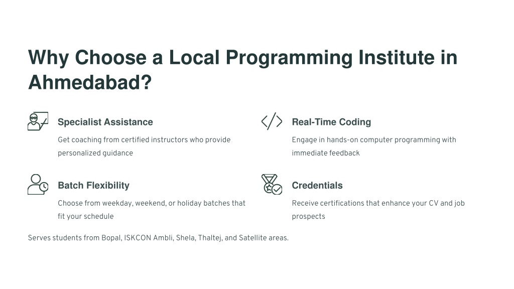 Why Choose a Local Programming Institute in Ahmedabad? Specialist Assistance Real-Time Coding Get coaching from certified instructors who provide personalized guidance Engage in hands-on computer programming with immediate feedback Batch Flexibility Credentials Choose from weekday, weekend, or holiday batches that fit your schedule Receive certifications that enhance your CV and job prospects Serves students from Bopal, ISKCON Ambli, Shela, Thaltej, and Satellite areas.