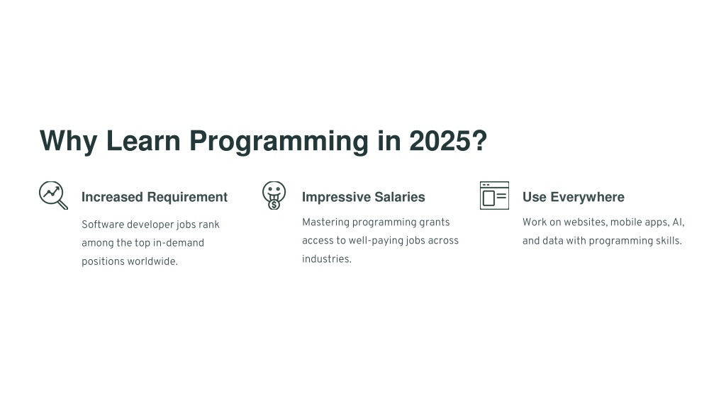 Why Learn Programming in 2025? Increased Requirement Impressive Salaries Use Everywhere Mastering programming grants access to well-paying jobs across industries. Work on websites, mobile apps, AI, and data with programming skills. Software developer jobs rank among the top in-demand positions worldwide.