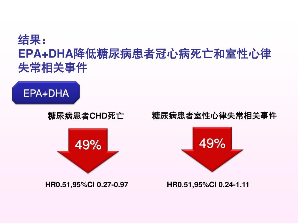 结果:EPA+DHA降低糖尿病患者冠心病死亡和室性心律失常相关事件结果:EPA+DHA降低糖尿病患者冠心病死亡和室性心律失常相关事件 EPA+DHA 49% 49% 糖尿病患者室性心律失常相关事件 糖尿病患者CHD死亡 HR0.51,95%CI 0.27-0.97 HR0.51,95%CI 0.24-1.11