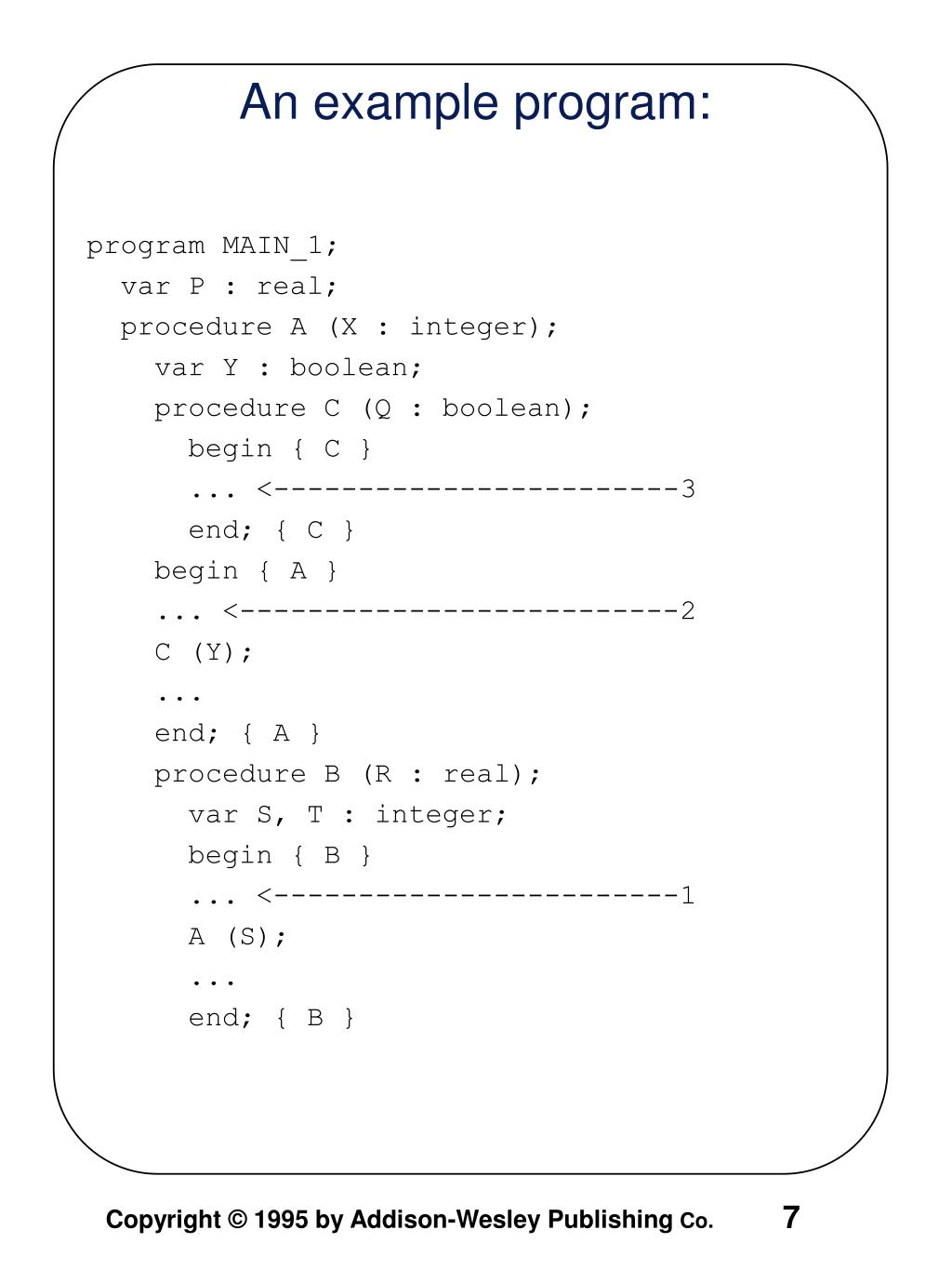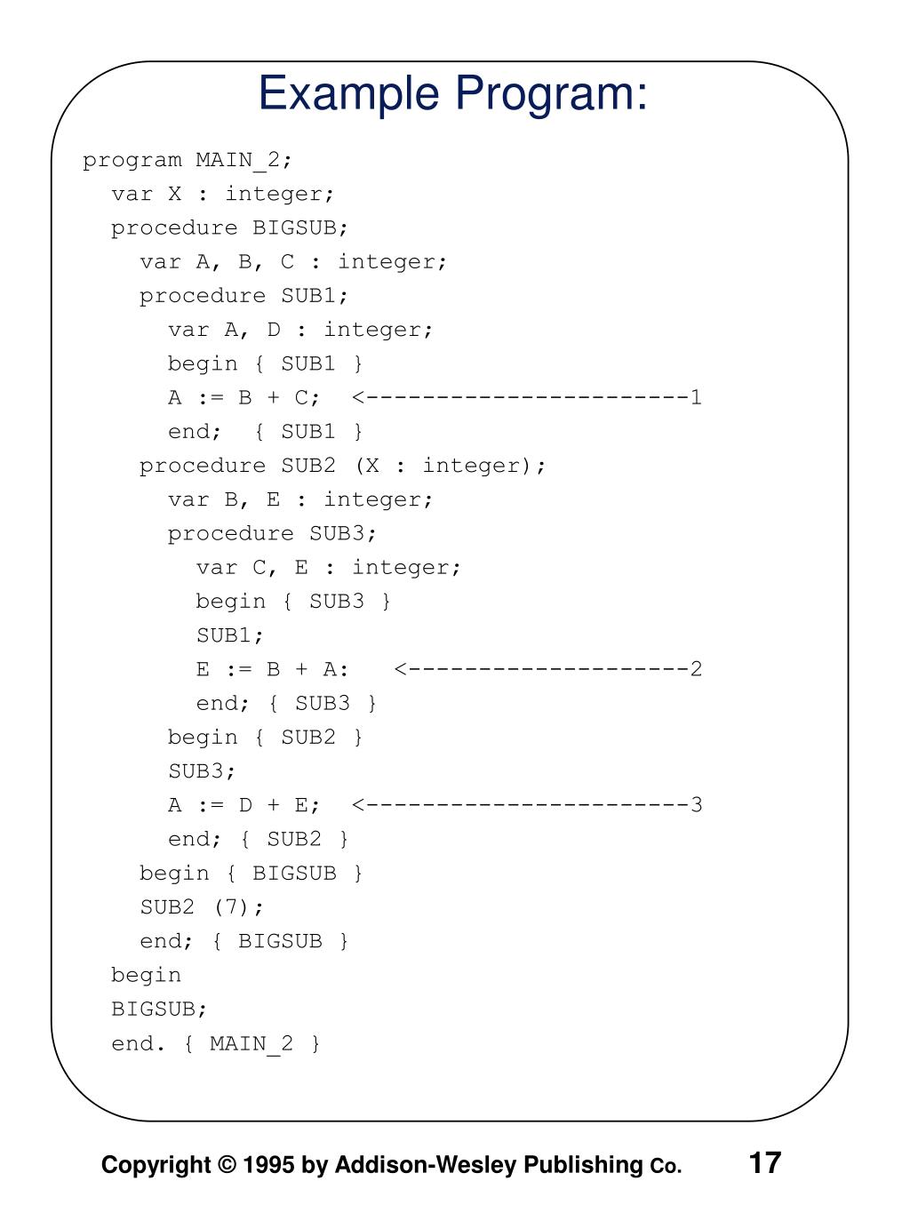 program MAIN_2; var X : integer; procedure BIGSUB; var A, B, C : integer; procedure SUB1; var A, D : integer; begin { SUB1 } A := B + C; <-----------------------1 end; { SUB1 } procedure SUB2 (X : integer); var B, E : integer; procedure SUB3; var C, E : integer; begin { SUB3 } SUB1; E := B + A: <--------------------2 end; { SUB3 } begin { SUB2 } SUB3; A := D + E; <-----------------------3 end; { SUB2 } begin { BIGSUB } SUB2 (7); end; { BIGSUB } begin BIGSUB; end. { MAIN_2 } Example Program: