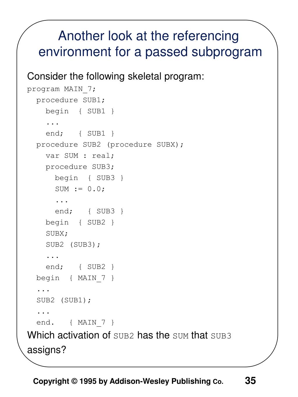Consider the following skeletal program: program MAIN_7; procedure SUB1; begin { SUB1 } ... end; { SUB1 } procedure SUB2 (procedure SUBX); var SUM : real; procedure SUB3; begin { SUB3 } SUM := 0.0; ... end; { SUB3 } begin { SUB2 } SUBX; SUB2 (SUB3); ... end; { SUB2 } begin { MAIN_7 } ... SUB2 (SUB1); ... end. { MAIN_7 } Which activation of SUB2 has the SUM that SUB3 assigns? Another look at the referencing environment for a passed subprogram