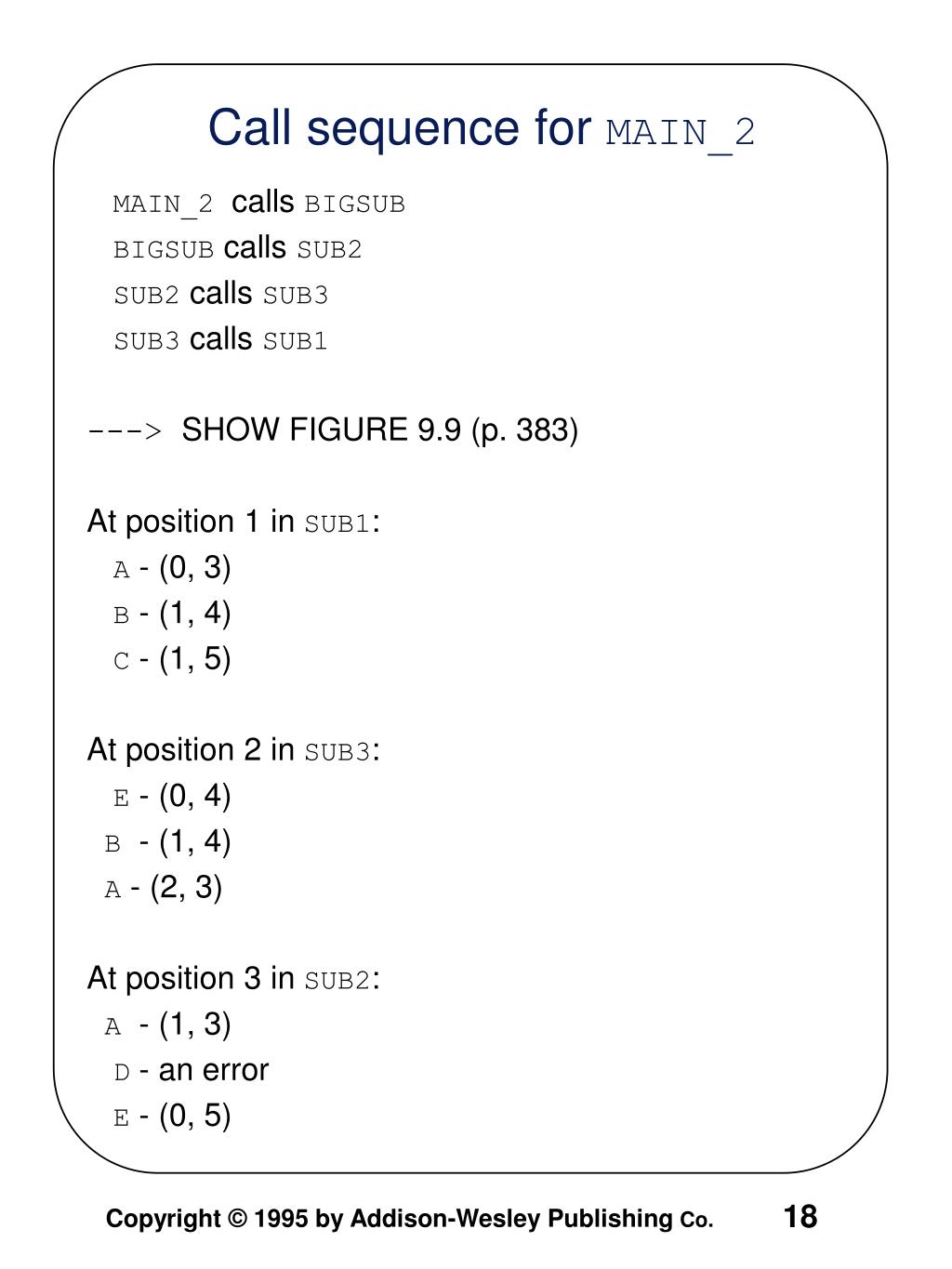 MAIN_2 calls BIGSUB BIGSUB calls SUB2 SUB2 calls SUB3 SUB3 calls SUB1 ---> SHOW FIGURE 9.9 (p. 383) At position 1 in SUB1: A - (0, 3) B - (1, 4) C - (1, 5) At position 2 in SUB3: E - (0, 4) B - (1, 4) A - (2, 3) At position 3 in SUB2: A - (1, 3) D - an error E - (0, 5) Call sequence for MAIN_2