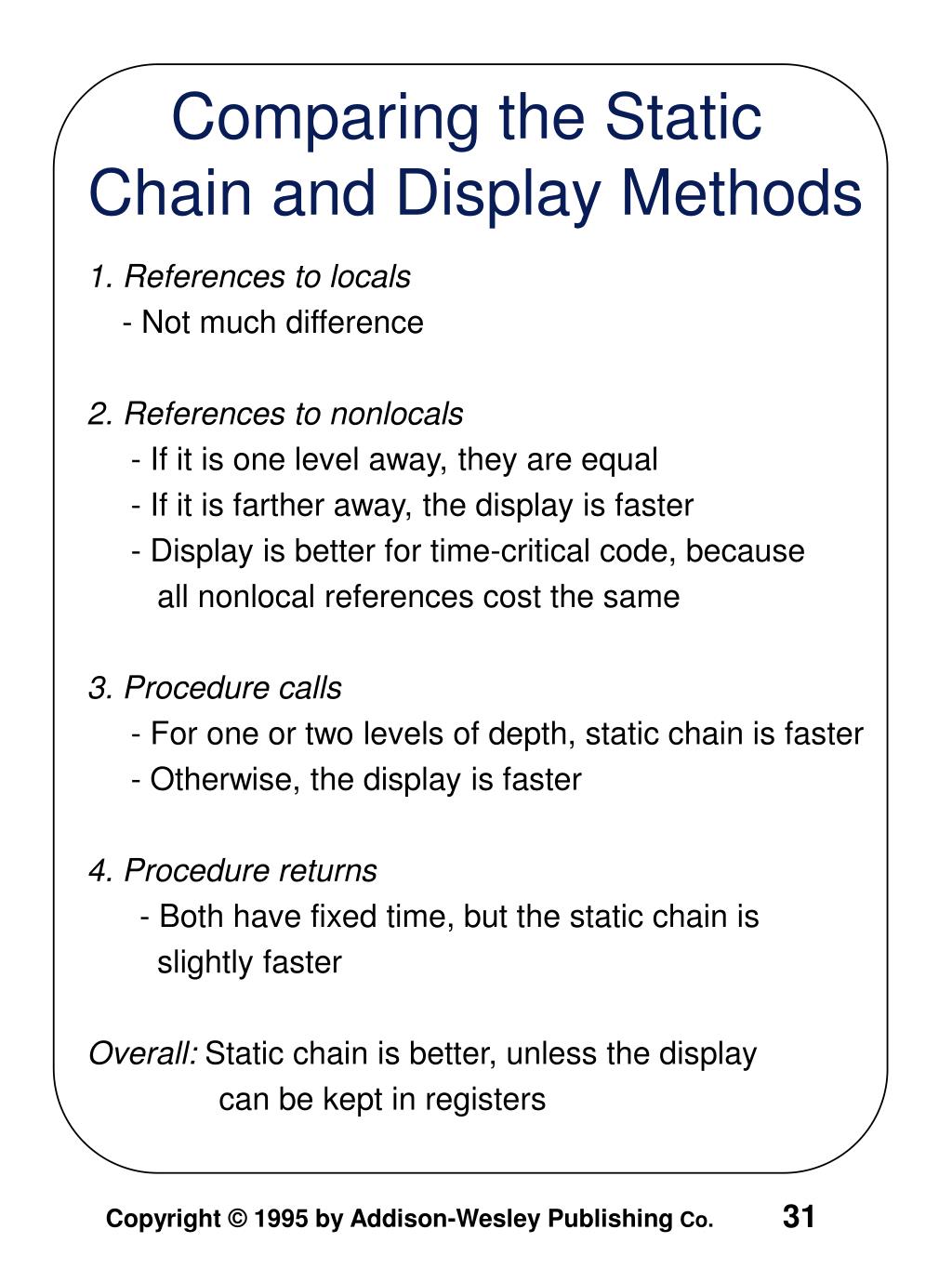 1. References to locals - Not much difference 2. References to nonlocals - If it is one level away, they are equal - If it is farther away, the display is faster - Display is better for time-critical code, because all nonlocal references cost the same 3. Procedure calls - For one or two levels of depth, static chain is faster - Otherwise, the display is faster 4. Procedure returns - Both have fixed time, but the static chain is slightly faster Overall: Static chain is better, unless the display can be kept in registers Comparing the Static Chain and Display Methods