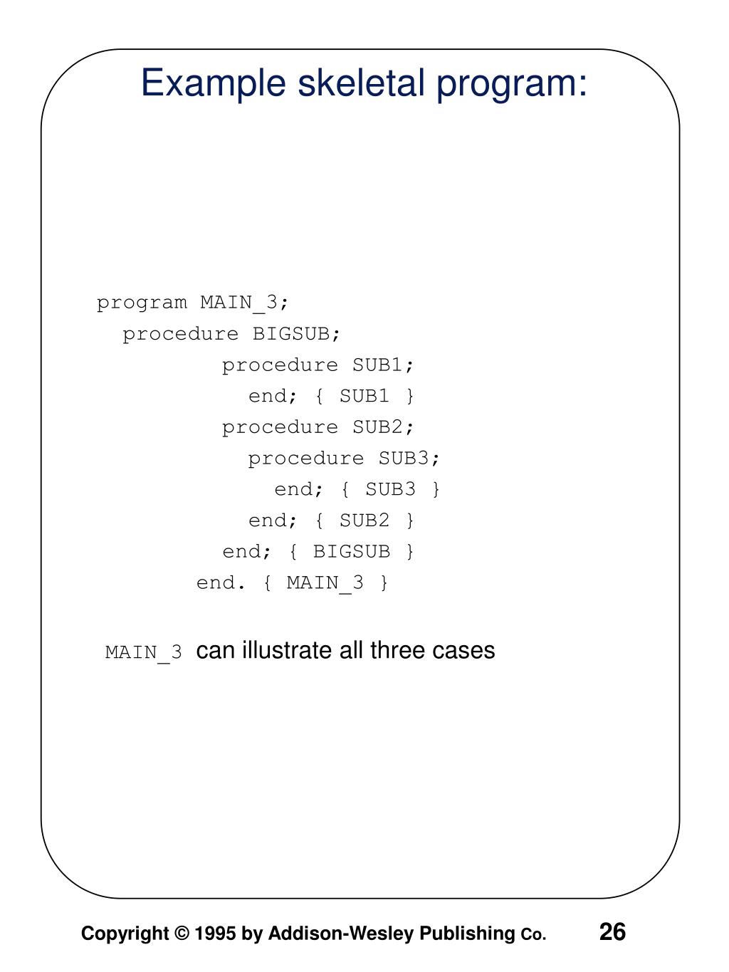 program MAIN_3; procedure BIGSUB; procedure SUB1; end; { SUB1 } procedure SUB2; procedure SUB3; end; { SUB3 } end; { SUB2 } end; { BIGSUB } end. { MAIN_3 } MAIN_3 can illustrate all three cases Example skeletal program: