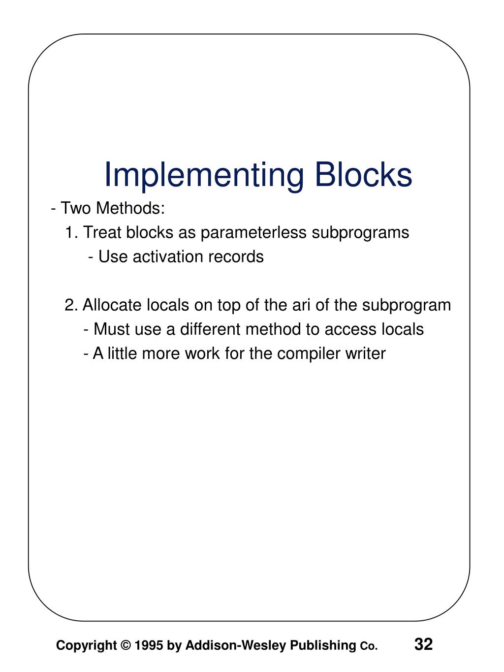 - Two Methods: 1. Treat blocks as parameterless subprograms - Use activation records 2. Allocate locals on top of the ari of the subprogram - Must use a different method to access locals - A little more work for the compiler writer Implementing Blocks