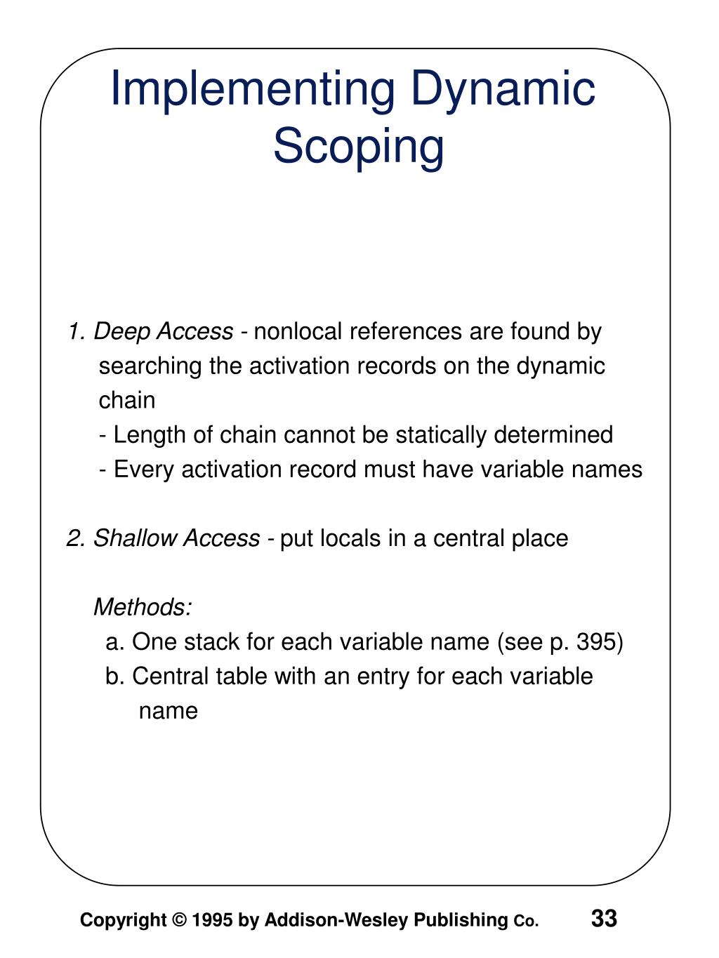 1. Deep Access - nonlocal references are found by searching the activation records on the dynamic chain - Length of chain cannot be statically determined - Every activation record must have variable names 2. Shallow Access - put locals in a central place Methods: a. One stack for each variable name (see p. 395) b. Central table with an entry for each variable name Implementing Dynamic Scoping