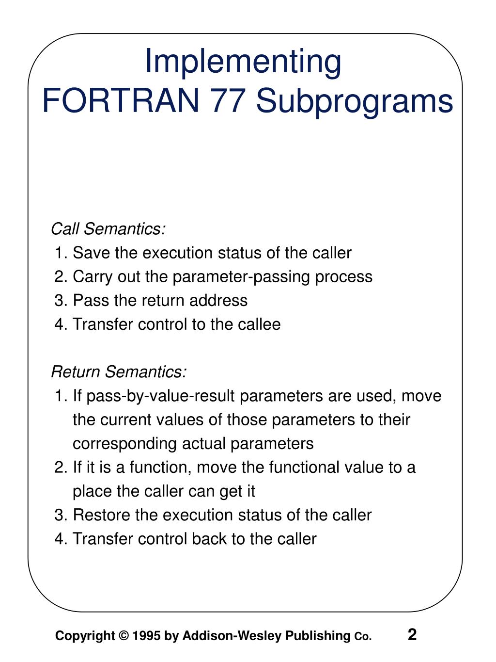 Call Semantics: 1. Save the execution status of the caller 2. Carry out the parameter-passing process 3. Pass the return address 4. Transfer control to the callee Return Semantics: 1. If pass-by-value-result parameters are used, move the current values of those parameters to their corresponding actual parameters 2. If it is a function, move the functional value to a place the caller can get it 3. Restore the execution status of the caller 4. Transfer control back to the caller Implementing FORTRAN 77 Subprograms