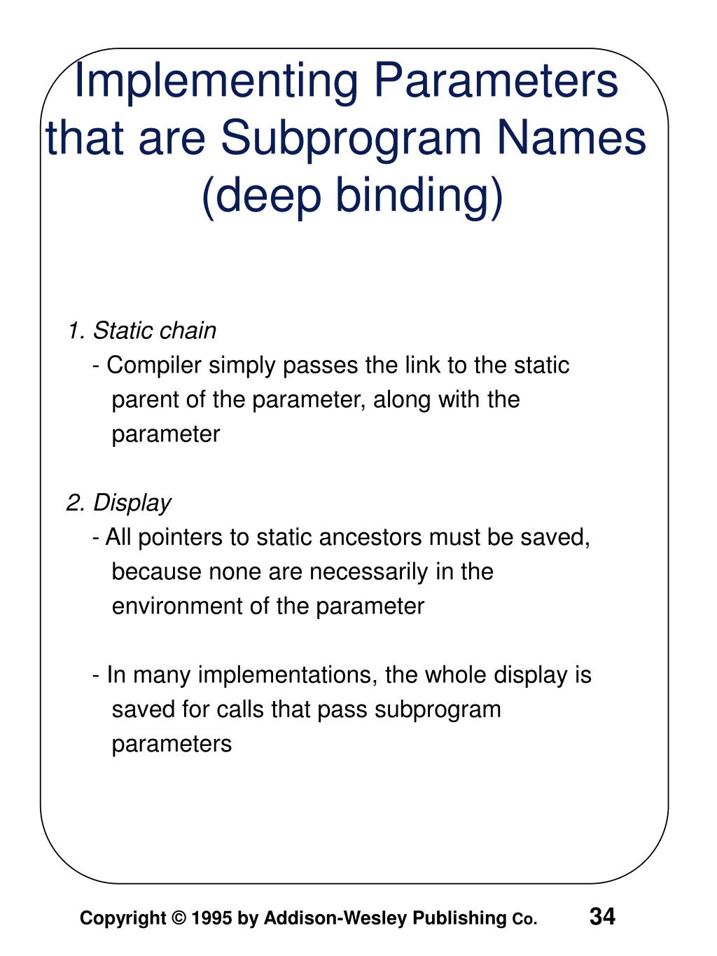1. Static chain - Compiler simply passes the link to the static parent of the parameter, along with the parameter 2. Display - All pointers to static ancestors must be saved, because none are necessarily in the environment of the parameter - In many implementations, the whole display is saved for calls that pass subprogram parameters Implementing Parameters that are Subprogram Names (deep binding)