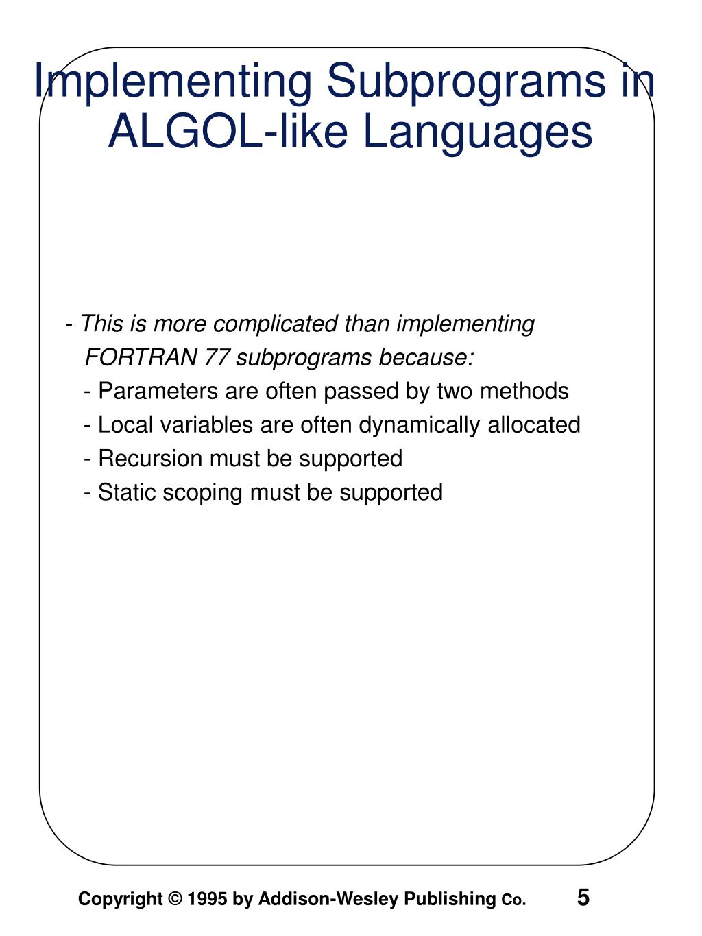 - This is more complicated than implementing FORTRAN 77 subprograms because: - Parameters are often passed by two methods - Local variables are often dynamically allocated - Recursion must be supported - Static scoping must be supported Implementing Subprograms in ALGOL-like Languages