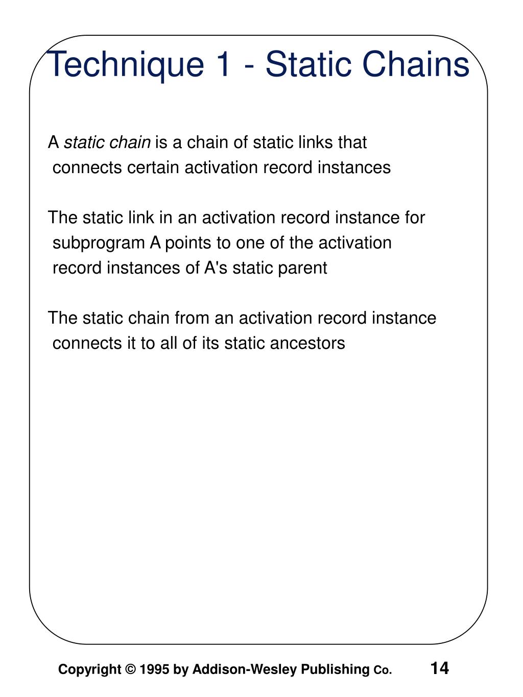 A static chain is a chain of static links that connects certain activation record instances The static link in an activation record instance for subprogram A points to one of the activation record instances of A's static parent The static chain from an activation record instance connects it to all of its static ancestors Technique 1 - Static Chains