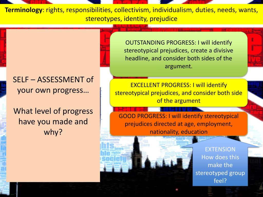 Terminology: rights, responsibilities, collectivism, individualism, duties, needs, wants, stereotypes, identity, prejudice OUTSTANDING PROGRESS: I will identify stereotypical prejudices, create a divisive headline, and consider both sides of the argument. EXCELLENT PROGRESS: I will identify stereotypical prejudices, and consider both side of the argument GOOD PROGRESS: I will identify stereotypical prejudices directed at age, employment, nationality, education