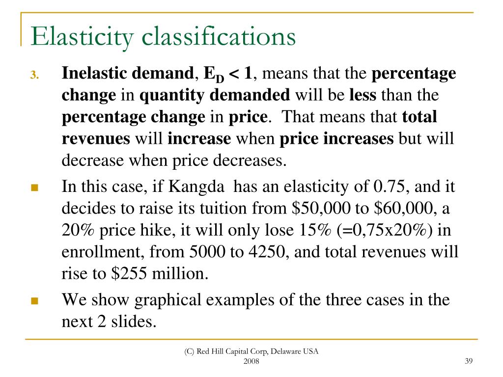 Elasticity classifications • We classify elasticity into 3 basic categories: • Elastic demand, ED > 1, means that the percentage change in quantity demandedchanges more than the percentage change in price. Thus, a reduction in price will cause total revenues to increase; a rise in price will cause total revenues to fall. • So, if elasticity of demand for Kangda college is 1.5, enrollment is 5000, and the price increases by 10% from $50,000/year to $55,000, then, enrollment will decrease by 1.5x10% = 15%. (C) Red Hill Capital Corp, Delaware USA 2008