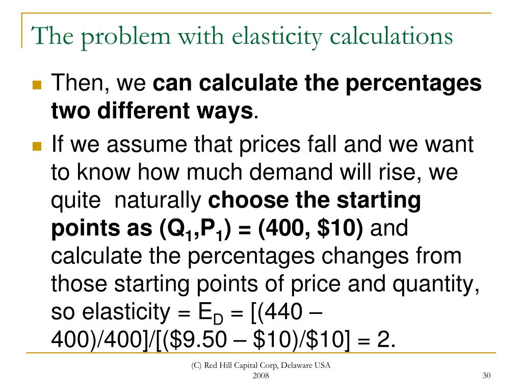 The problem with elasticity calculations • Then, we can calculate the percentages two different ways. • If we assume that prices fall and we want to know how much demand will rise, we quite naturally choose the starting points as (Q1,P1) = (400, $10) and calculate the percentages changes from those starting points of price and quantity, so elasticity = ED = [(440 – 400)/400]/[($9.50 – $10)/$10] = 2. (C) Red Hill Capital Corp, Delaware USA 2008