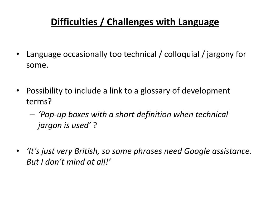 Difficulties / Challenges with Language • Language occasionally too technical / colloquial / jargony for some. • Possibility to include a link to a glossary of development terms? • ‘Pop-up boxes with a short definition when technical jargon is used’ ? • ‘It’s just very British, so some phrases need Google assistance. But I don’t mind at all!’
