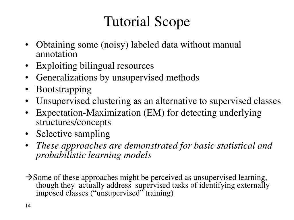 Tutorial Scope • Obtaining some (noisy) labeled data without manual annotation • Exploiting bilingual resources • Generalizations by unsupervised methods • Bootstrapping • Unsupervised clustering as an alternative to supervised classes • Expectation-Maximization (EM) for detecting underlying structures/concepts • Selective sampling • These approaches are demonstrated for basic statistical and probabilistic learning models Some of these approaches might be perceived as unsupervised learning, though they actually address supervised tasks of identifying externally imposed classes (“unsupervised” training)