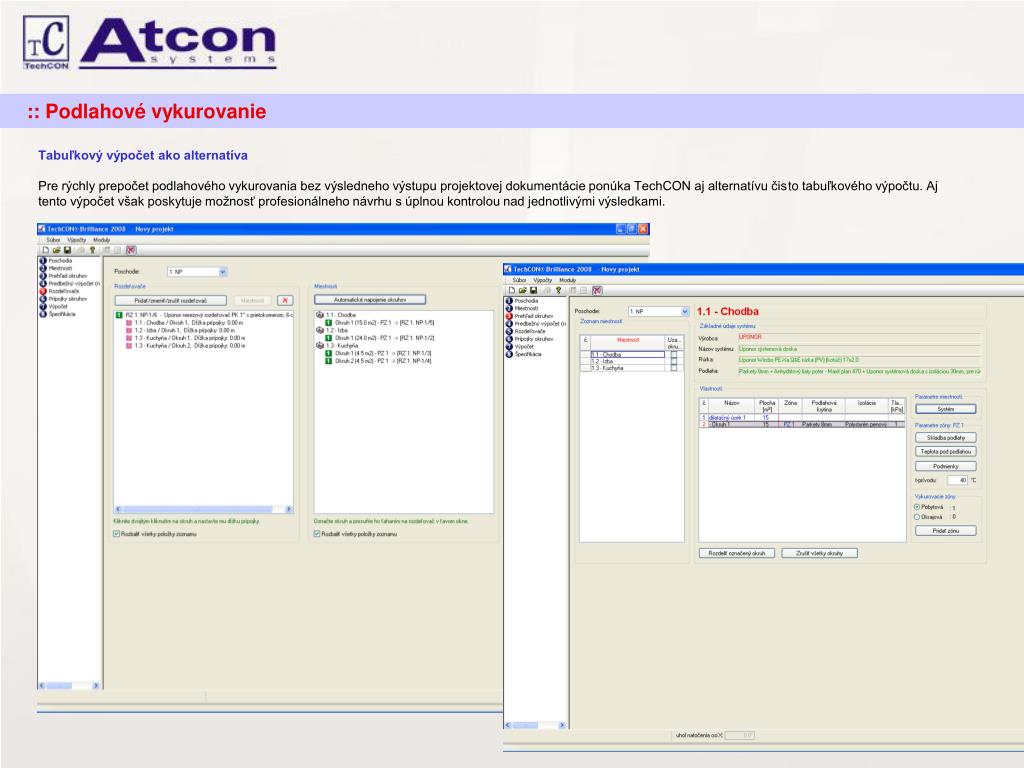 TechCON. TechCON je moderný grafický výpočtový software určený na návrh a spracovanie projektov ústredného vykurovania pre operačné systémy Windows 9x/ME/NT4/2000/XP. Je tvorený z dvoch navzájom prepojených modulov: Tepelné straty a Ústredné vykurovanie.