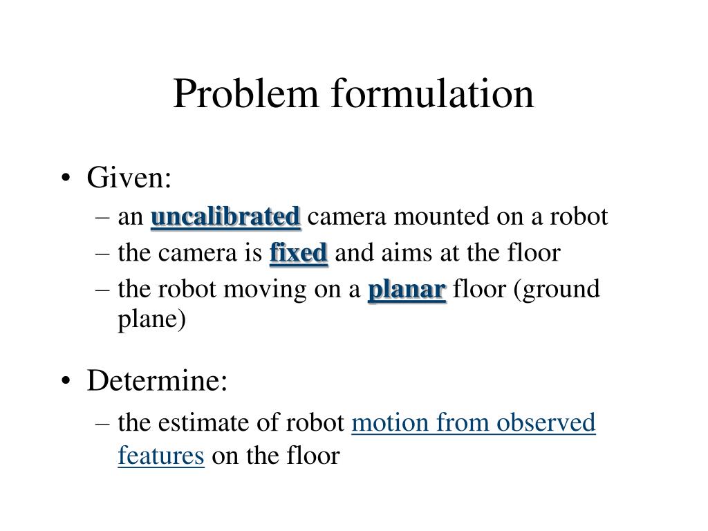 Problem formulation • Given: • an uncalibratedcamera mounted on a robot • the camera is fixed and aims at the floor • the robot moving on a planar floor (ground plane) • Determine: • the estimate of robot motion from observed features on the floor