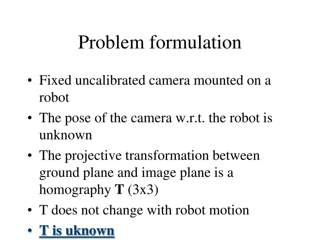 Problem formulation • Fixed uncalibrated camera mounted on a robot • The pose of the camera w.r.t. the robot is unknown • The projective transformation between ground plane and image plane is a homography T (3x3) • T does not change with robot motion • T is uknown