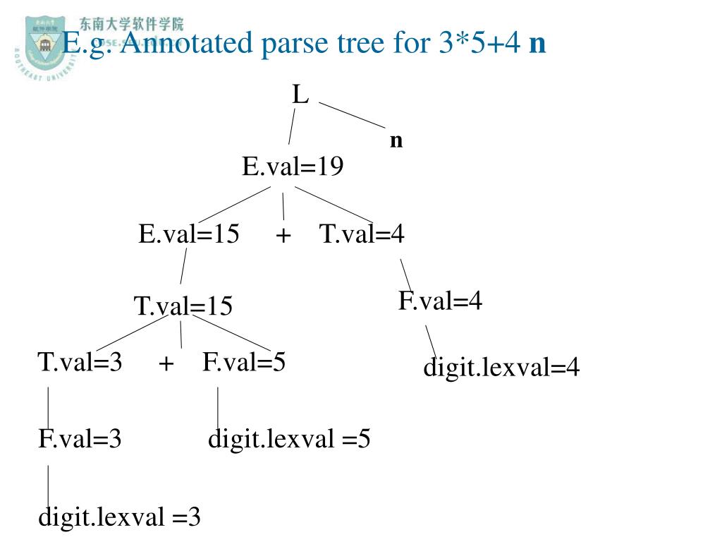 E.g. Annotated parse tree for 3*5+4 n F.val=4 digit.lexval=4 F.val=3 digit.lexval =3 digit.lexval =5 L n E.val=19 E.val=15 + T.val=4 T.val=15 T.val=3 + F.val=5