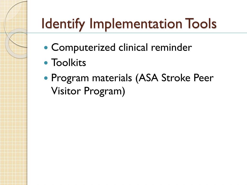 Identify Implementation Tools • Computerized clinical reminder • Toolkits • Program materials (ASA Stroke Peer Visitor Program)