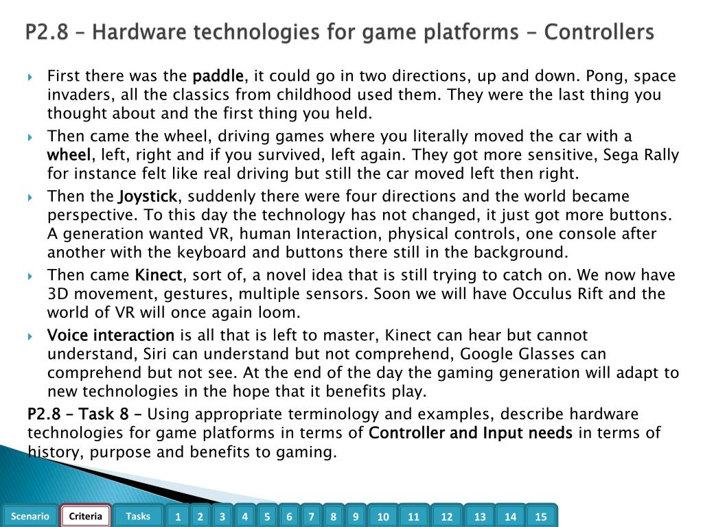 P2.8 – Hardware technologies for game platforms - Controllers • First there was the paddle, it could go in two directions, up and down. Pong, space invaders, all the classics from childhood used them. They were the last thing you thought about and the first thing you held. • Then came the wheel, driving games where you literally moved the car with a wheel, left, right and if you survived, left again. They got more sensitive, Sega Rally for instance felt like real driving but still the car moved left then right. • Then the Joystick, suddenly there were four directions and the world became perspective. To this day the technology has not changed, it just got more buttons. A generation wanted VR, human Interaction, physical controls, one console after another with the keyboard and buttons there still in the background. • Then came Kinect, sort of, a novel idea that is still trying to catch on. We now have 3D movement, gestures, multiple sensors. Soon we will have Occulus Rift and the world of VR will once again loom. • Voice interaction is all that is left to master, Kinect can hear but cannot understand, Siri can understand but not comprehend, Google Glasses can comprehend but not see. At the end of the day the gaming generation will adapt to new technologies in the hope that it benefits play. P2.8 – Task 8 – Using appropriate terminology and examples, describe hardware technologies for game platforms in terms of Controller and Inputneeds in terms of history, purpose and benefits to gaming.