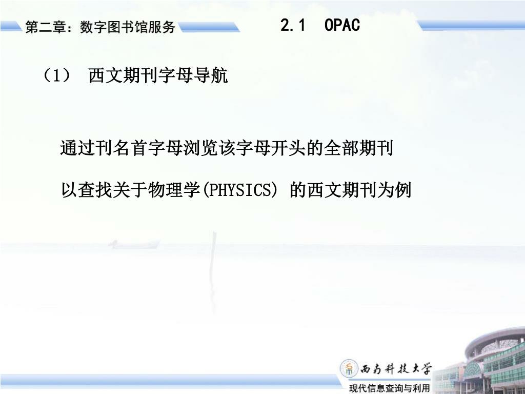 2.1 OPAC (1)西文期刊字母导航 通过刊名首字母浏览该字母开头的全部期刊 以查找关于物理学(PHYSICS) 的西文期刊为例
