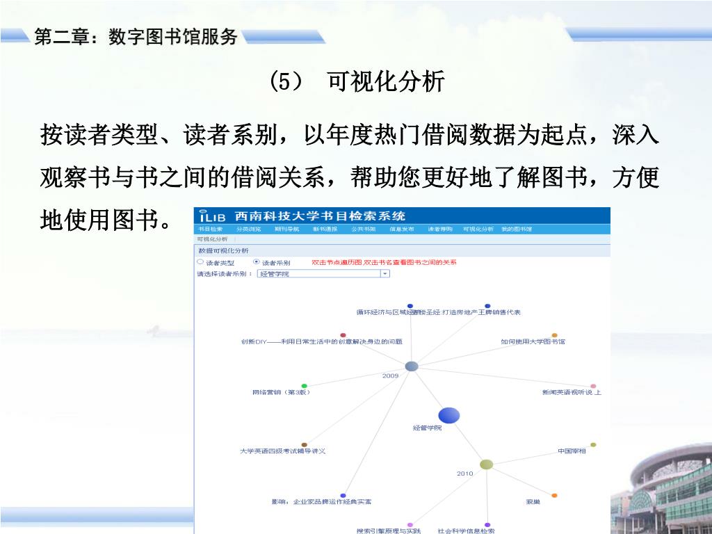 2.1 OPAC 2.1.3 SWUST OPAC其它功能及使用示例 1)新书通报 2)公共书架 3)信息发布 4)读者荐购 5)可视化分析 6)我的图书馆