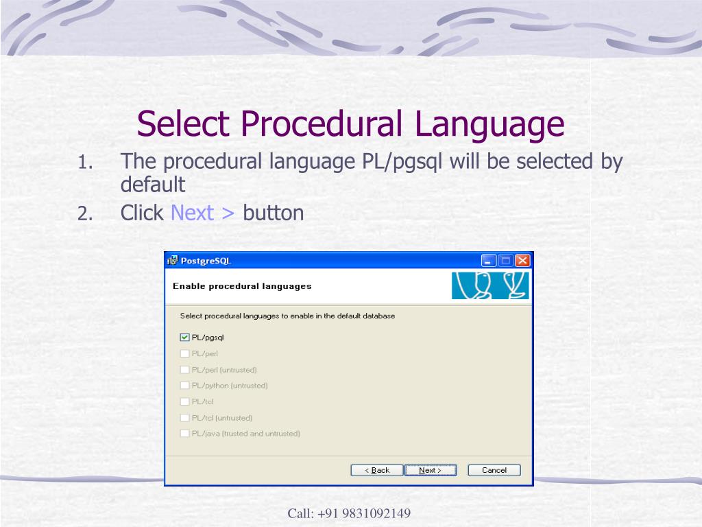 Select Procedural Language • The procedural language PL/pgsql will be selected by default • Click Next > button Call: +91 9831092149
