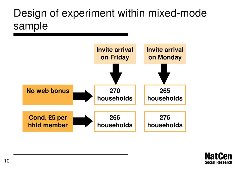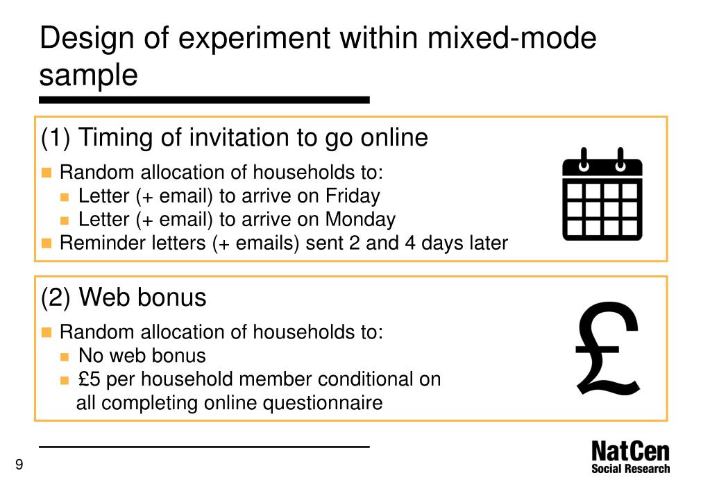 Design of experiment within mixed-mode sample • (1) Timing of invitation to go online • Random allocation of households to: • Letter (+ email) to arrive on Friday • Letter (+ email) to arrive on Monday • Reminder letters (+ emails) sent 2 and 4 days later • (2) Web bonus • Random allocation of households to: • No web bonus • £5 per household member conditional on all completing online questionnaire