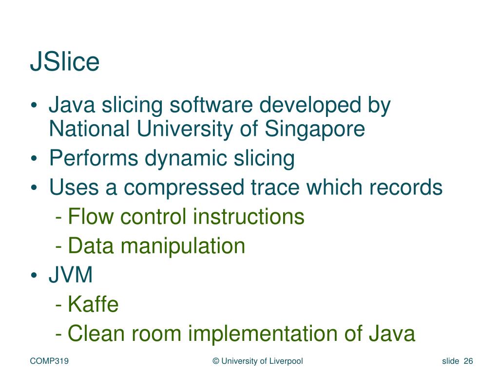 JSlice • Java slicing software developed by National University of Singapore • Performs dynamic slicing • Uses a compressed trace which records • Flow control instructions • Data manipulation • JVM • Kaffe • Clean room implementation of Java COMP319