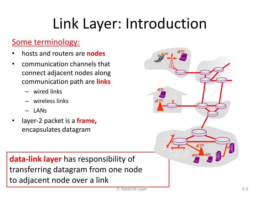 Some terminology: hosts and routers are nodes communication channels that connect adjacent nodes along communication path are links wired links wireless links LANs layer-2 packet is a frame,encapsulates datagram Link Layer: Introduction data-link layer has responsibility of transferring datagram from one node to adjacent node over a link 5: DataLink Layer