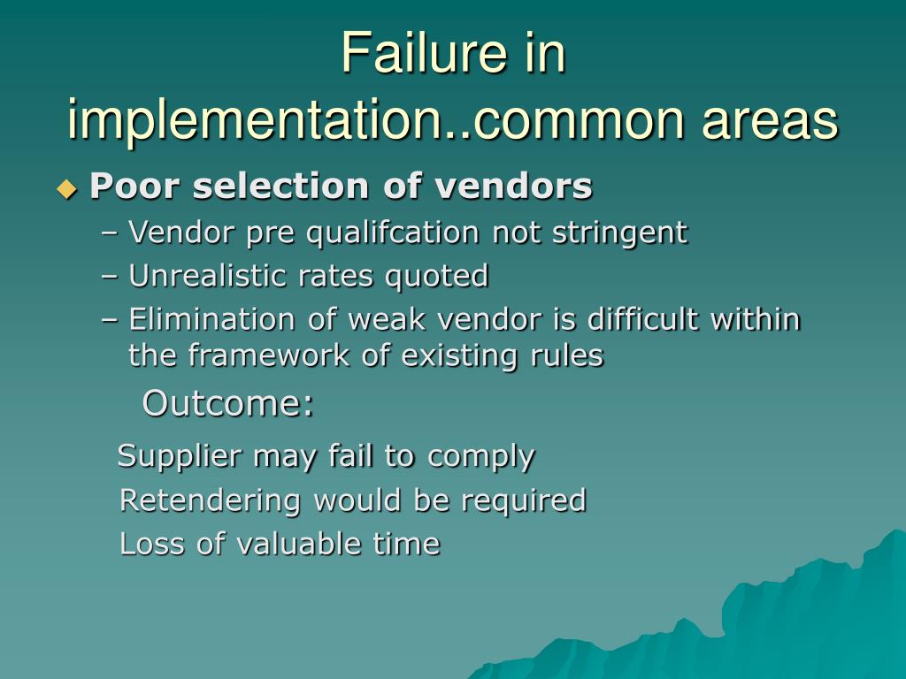 Failure in implementation..common areas Poor selection of vendors Vendor pre qualifcation not stringent Unrealistic rates quoted Elimination of weak vendor is difficult within the framework of existing rules Outcome: Supplier may fail tocomply Retendering would be required Loss of valuable time