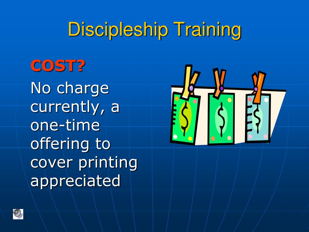 Discipleship Training COST? No charge currently, a one-time offering to cover printing appreciated