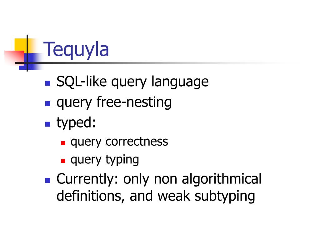 Tequyla • SQL-like query language • query free-nesting • typed: • query correctness • query typing • Currently: only non algorithmical definitions, and weak subtyping