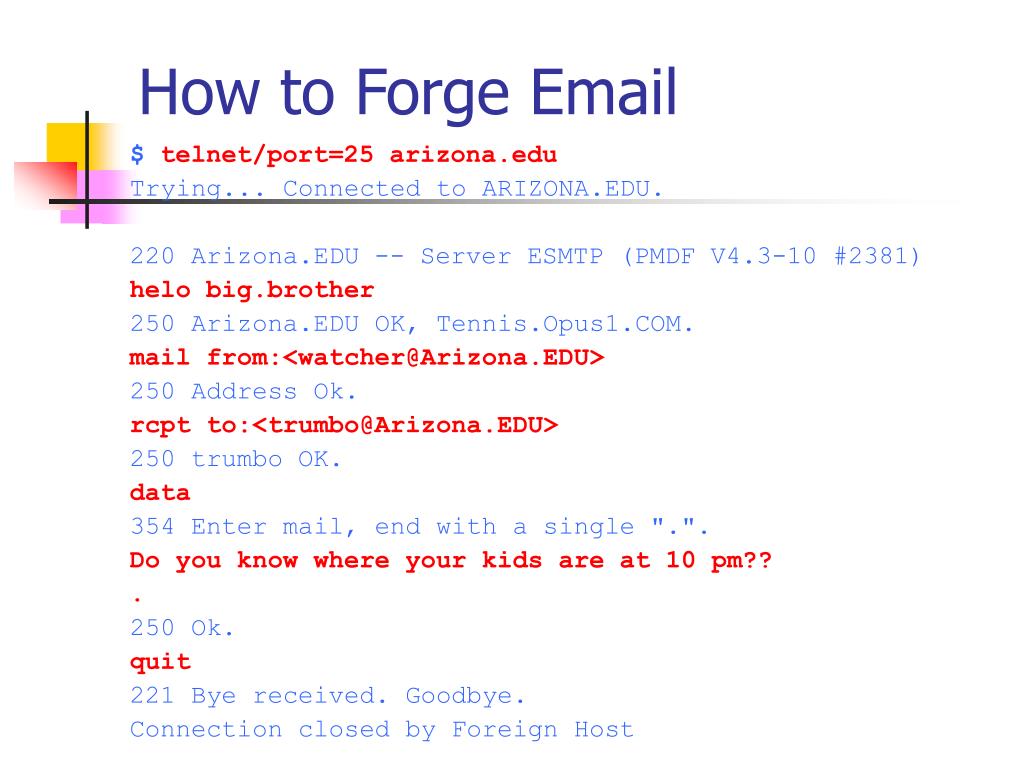 How to Forge Email $ telnet/port=25 arizona.edu Trying... Connected to ARIZONA.EDU. 220 Arizona.EDU -- Server ESMTP (PMDF V4.3-10 #2381) helo big.brother 250 Arizona.EDU OK, Tennis.Opus1.COM. mail from:<watcher@Arizona.EDU> 250 Address Ok. rcpt to:<trumbo@Arizona.EDU> 250 trumbo OK. data 354 Enter mail, end with a single ".". Do you know where your kids are at 10 pm?? . 250 Ok. quit 221 Bye received. Goodbye. Connection closed by Foreign Host