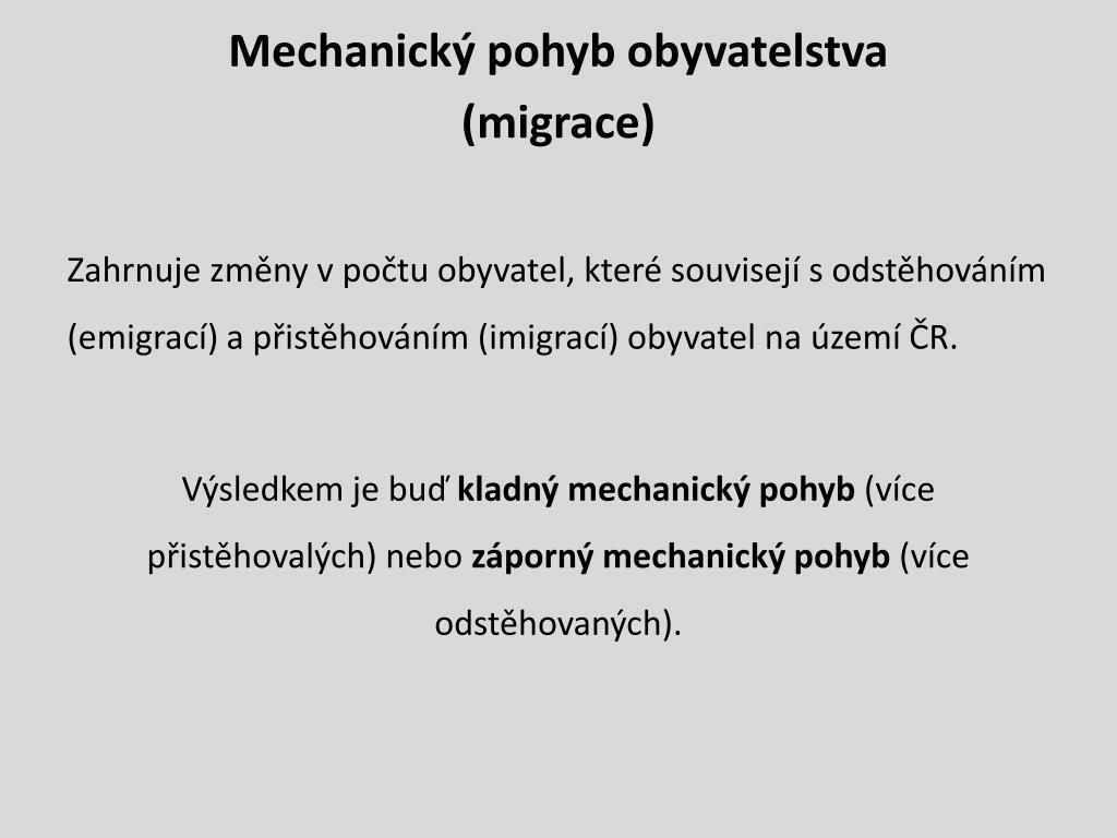 Mechanický pohyb obyvatelstva (migrace) Zahrnuje změny v počtu obyvatel, které souvisejí s odstěhováním (emigrací) a přistěhováním (imigrací) obyvatel na území ČR. Výsledkem je buď kladný mechanický pohyb(více přistěhovalých) nebo záporný mechanický pohyb(více odstěhovaných).