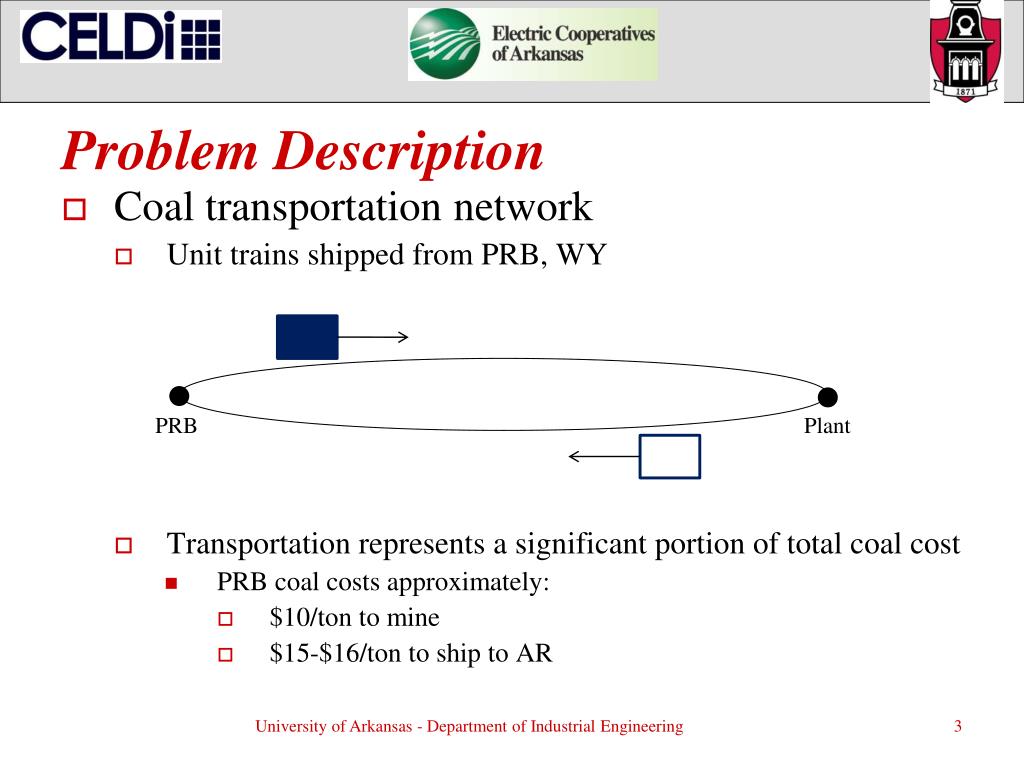 Problem Description • Coal transportation network • Unit trains shipped from PRB, WY • Transportation represents a significant portion of total coal cost • PRB coal costs approximately: • $10/ton to mine • $15-$16/ton to ship to AR PRB Plant University of Arkansas - Department of Industrial Engineering