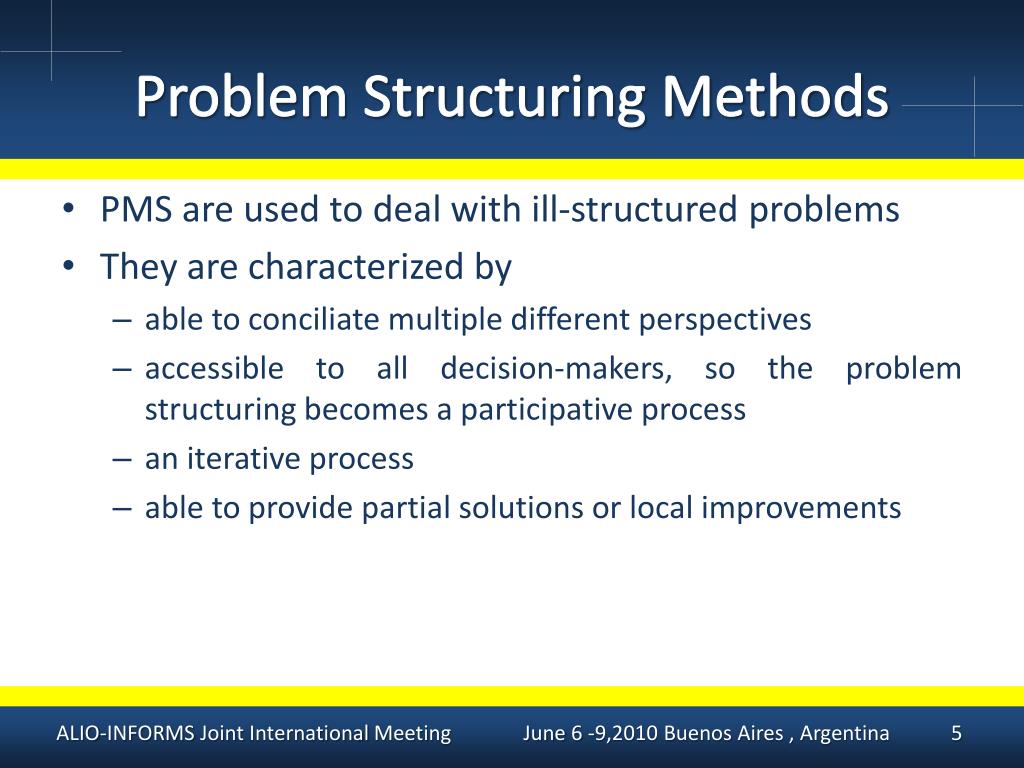 Problem Structuring Methods • PMS are used to deal with ill-structured problems • They are characterized by • able to conciliate multiple different perspectives • accessible to all decision-makers, so the problem structuring becomes a participative process • an iterative process • able to provide partial solutions or local improvements ALIO-INFORMS JointInternational Meeting June 6 -9,2010 Buenos Aires , Argentina