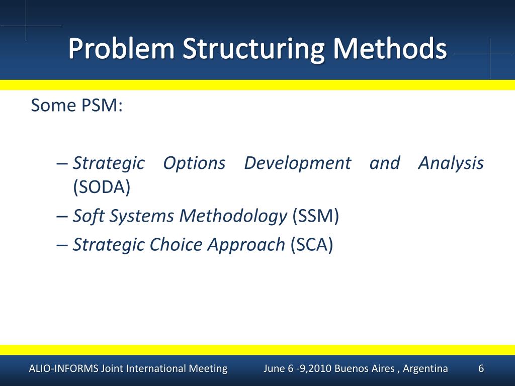 Problem Structuring Methods Some PSM: • Strategic Options Development and Analysis (SODA) • Soft Systems Methodology (SSM) • Strategic Choice Approach (SCA) ALIO-INFORMS JointInternational Meeting June 6 -9,2010 Buenos Aires , Argentina