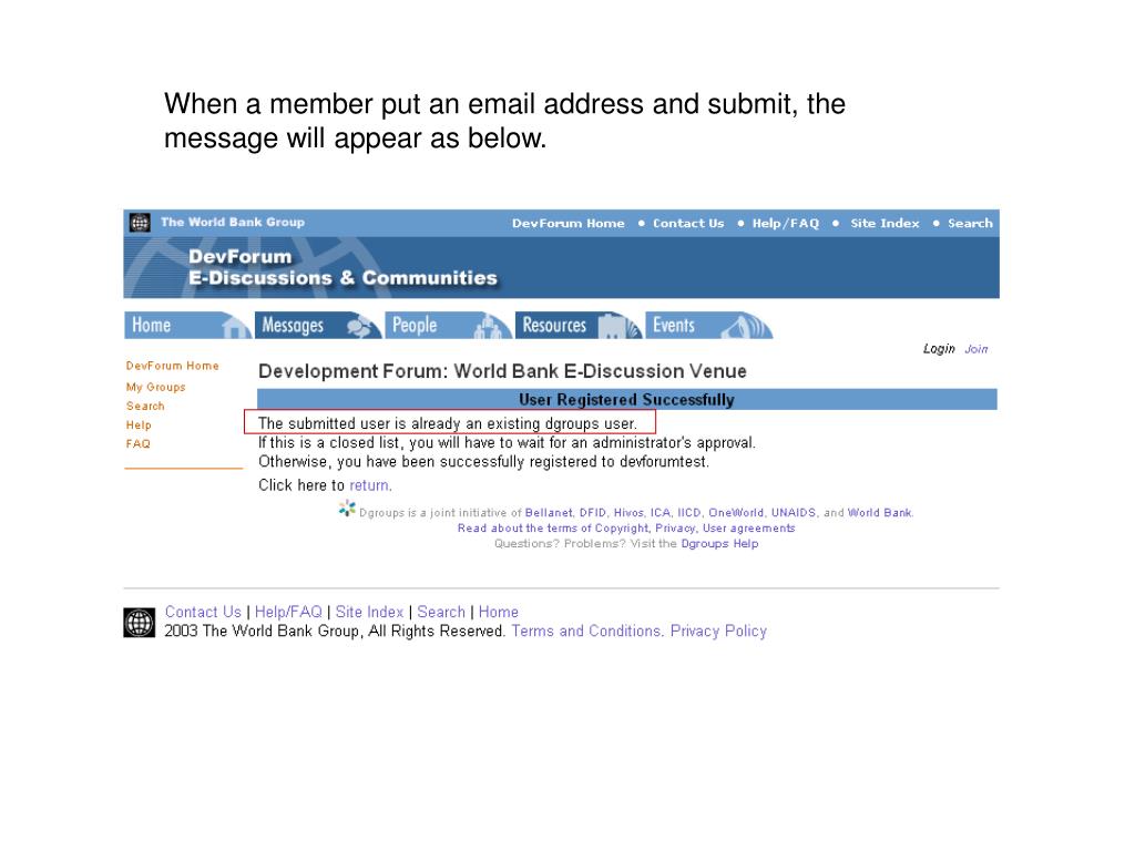 The auto email will be addressed by a primary administrator’s email. The body text is auto generated. From:jseo@worldbank.orgTo:jeester@mac.comDate: Tue Jun 21, 2005 01:17:35 PM PDTSubject:Dgroups Registration Hello, The following details were submitted to Dgroups (www.dgroups.org) as part of a new user registration for an online community: User Name:jen seo E-mail: jeester@mac.com Password: test This may have been done by you, or by Jeeyeon Seo (jseo@worldbank.org) administrator of Development Forum: World Bank E-Discussion Venue. You may visit this community here: http://www.dgroups.org/groups/worldbank/devforumtestPlease note that messages to the list should be sent to: devforumtest@dgroups.org. Messages sent to the above address will be sent out to all participants in the discussion. You can use your new password to enter this community, as well as any other Dgroups community of which you are a member. Please save this message as a reminder of your password. If you encounter any problems, please contact the administrator of this Dgroup by sending an email to devforumtest-owner@dgroups.org. Welcome to Dgroups. The Dgroups Administrator PS: If this is not correct, or if you do not wish to be part of this community, then you may delete your new account and profile by going here: http://www.dgroups.org/groups/worldbank/devforumtest/index.cfm?op=dsp_cancel_registration&user_id=37935&cat_id=11940.Dgroups is a joint initiative of Bellanet, DFID, Hivos, ICA, IICD, OneWorld, UNAIDS and World Bank. Long name title would appear here.