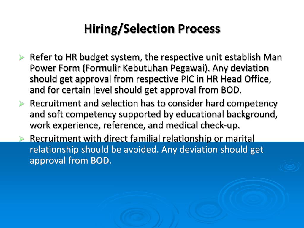 Hiring/Selection Process • Refer to HR budget system, the respective unit establish Man Power Form (FormulirKebutuhanPegawai). Any deviation should get approval from respective PIC in HR Head Office, and for certain level should get approval from BOD. • Recruitment and selection has to consider hard competency and soft competency supported by educational background, work experience, reference, and medical check-up. • Recruitment with direct familial relationship or marital relationship should be avoided. Any deviation should get approval from BOD.