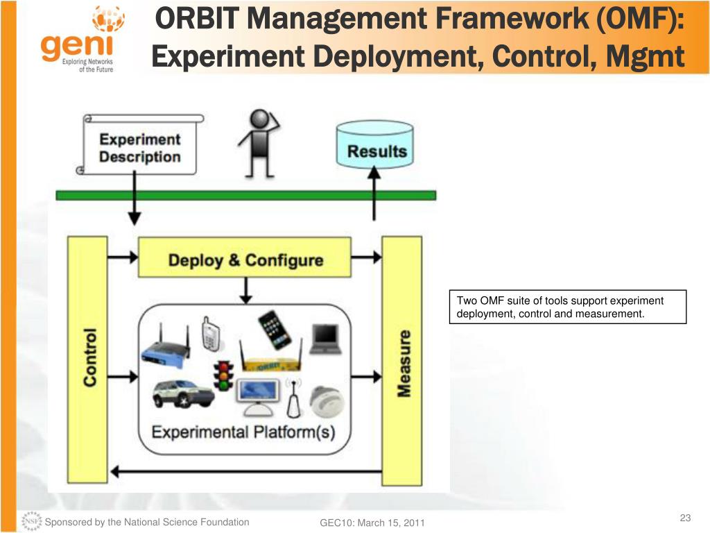 ORBIT Management Framework (OMF): Experiment Deployment, Control, Mgmt Two OMF suite of tools support experiment deployment, control and measurement.